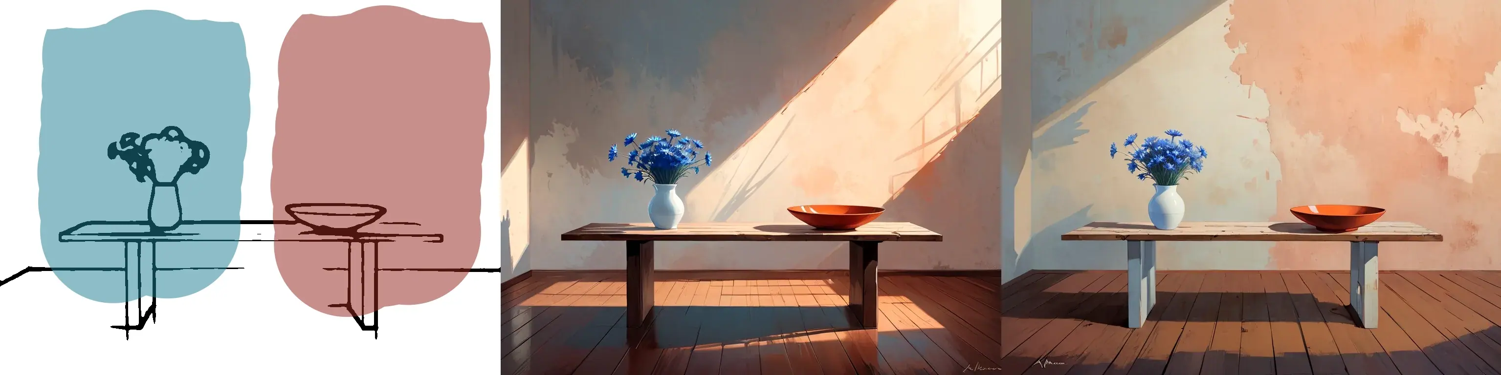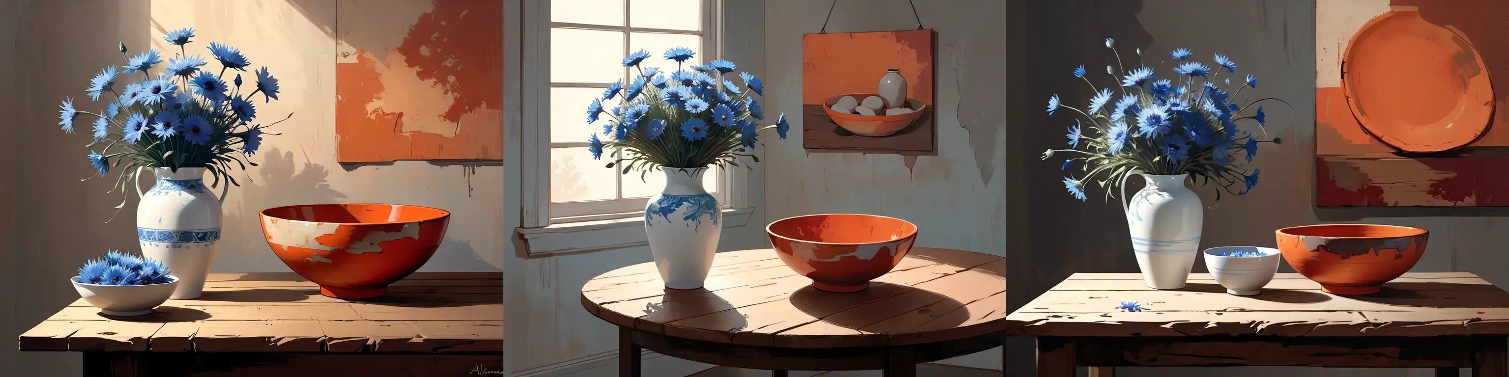 a simple wooden table in a stark empty room, on the left a white porcelain vase with light blue cornflowers, on the right an earthenware bowl, rough shape, painted with muted shades of orange and red