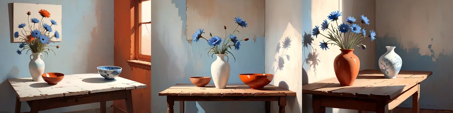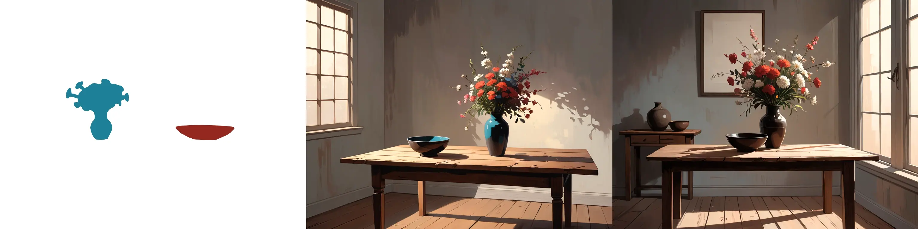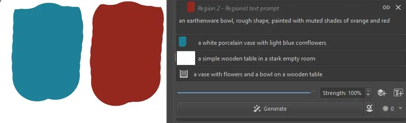 an earthenware bowl, rough shape, painted with muted shades of orange and reda white porcelain vase with light blue cornflowersa simple wooden table in a stark empty rooma vase with flowers and a bowl on a wooden tableThe prompt is split up between three regions. Specifying “on the left”, “on the right” in the text is no longer needed. Instead there is a “Root” prompt which describes the overall composition of the image without going into details.